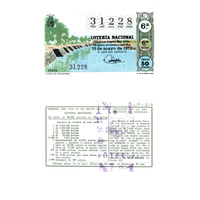 - Décimo da Lotaría Nacional de 1973 co motivo "España medra": imaxe que representa o canal de Monegros na provincia de Huesca. O número do décimo é o 31228 / ANVERSO. Impresión / (Escudo) / 31228 / Lotería Nacional. Décima parte del billete para el sorteo del día 19 de mayo de 1973 / El jefe del servicio (sinatura) / Sexta / 31228 / 16/73 / 6ª / 6ª serie / Precio 50 pesetas / "Canal de Monegros" (imaxe) / Fca. Nal. de Moneda y Timbre / REVERSO. Impresión / Sorteo del día 19 de mayo de 1973. Sistema moderno. 10 series de 80.000 billetes de 500 pesetas. (Resumo de premios) / Extracto de la instrucción de Loterías (texto) / Próximo sorteo: 26 de mayo. Billetes de 500 ptas., en décimos de 50 ptas