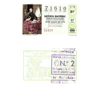 - Décimo da Lotaría Nacional de 1974 co motivo "O libro": imaxe que representa a obra de El Greco "San Ildefonso". O número do décimo é o 71610 / ANVERSO. Impresión / 71610 / Lotería Nacional. Décima parte del billete para el sorteo del día 19 de enero de 1974 / El jefe del servicio (sinatura) / Octava / 71610 / 3/74 / 8ª / 5ª serie / Precio 100 pesetas / San Ildefonso (El Greco) (imaxe) / Fca. Nal. de Moneda y Timbre / REVERSO. Impresión / Sorteo del día 19 de enero de 1974. Sistema moderno. 8 series de 80.000 billetes de 1.000 pesetas. (Resumo de premios) / Extracto de la instrucción de Loterías (texto) / Próximo sorteo: 26 de enero. Billetes de 500 ptas., en décimos de 50 ptas