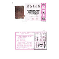 - Décimo da Lotaría Nacional de 1974 co motivo "O libro": imaxe que representa unha encadernación mudéxar do s. XV. O número do décimo é o 05165 / ANVERSO. Impresión / 05165 / Lotería Nacional. Décima parte del billete para el sorteo del día 9 de marzo de 1974 / El jefe del servicio (sinatura) / Primera / 05165 / 10/74 / 4ª serie / Precio 100 pesetas / Encuadernación mudéjar s. XV / Fca. Nal. de Moneda y Timbre / REVERSO. Impresión / Sorteo del día 9 de marzo de 1974. Sistema moderno. 8 series de 80.000 billetes de 1.000 pesetas. (Resumo de premios) / Extracto de la instrucción de Loterías (texto) / Próximo sorteo: 16 de marzo. Billetes de 1.000 ptas., en décimos de 100 ptas