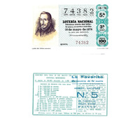 - Décimo da Lotaría Nacional de 1974 co motivo "O libro": imaxe que representa un retrato de Lope de Vega. O número do décimo é o 74382 / ANVERSO. Impresión / 74382 / Lotería Nacional. Décima parte del billete para el sorteo del día 18 de mayo de 1974 / El jefe del servicio (sinatura) / Quinta / 74382 / 18/74 / 5ª / 3ª serie / Precio 100 pesetas / Lope de Vega (retrato) (imaxe) / Fca. Nal. de Moneda y Timbre / REVERSO. Impresión / Sorteo del día 18 de mayo de 1974. Sistema moderno. 8 series de 80.000 billetes de 1.000 ptas. (Resumo de premios) / Extracto de la instrucción de Loterías (texto) / Próximo sorteo: 25 de mayo. Billetes de 500 ptas., en décimos de 50 ptas