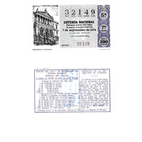 - Décimo "Especial do Turista" da Lotaría Nacional de 1974 co motivo "O libro": imaxe que representa a Biblioteca Nacional. O número do décimo é o 32149 / ANVERSO. Impresión / 32149 / Lotería Nacional. Décima parte del billete para el sorteo del día 7 de septiembre de 1974 / El jefe del servicio (sinatura) / Quinta / 32149 / 31/74 / 5ª / 7ª serie / Precio 200 pesetas / Biblioteca Nacional (imaxe) / Fca. Nal. de Moneda y Timbre / REVERSO. Impresión / Sorteo del día 7 de septiembre de 1974. Sistema moderno. Especial del turista. 8 series de 80.000 billetes de 2.000 pesetas. (Resumo de premios) / Extracto de la instrucción de Loterías (texto) / Próximo sorteo: 14 de septiembre. Billetes de 1.000 ptas., en décimos de 100 ptas