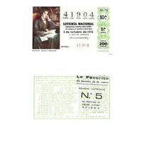 - Décimo "Especial de Outono" da Lotaría Nacional de 1974 co motivo "O libro": imaxe que representa un retrato de Gustavo Adolfo Becquer. O número do décimo é o 41904 / ANVERSO. Impresión / 41904 / Lotería Nacional. Décima parte del billete para el sorteo del día 5 de octubre de 1974 / El jefe del servicio (sinatura) / Décima / 41904 / 35/74 / 10ª / 5ª serie / Precio 200 pesetas / Gustavo Adolfo Becker (imaxe) / Fca. Nal. de Moneda y Timbre / REVERSO. Impresión / Extracto de la instrucción de Loterías (texto) / Próximo sorteo: 12 de octubre. Billetes de 2.000 ptas., en décimos de 200 ptas