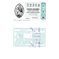- Décimo da Lotaría Nacional de 1974 co motivo "O libro": imaxe que representa a marca do impresor Martín Montesdeoca. O número do décimo é o 59304 / ANVERSO. Impresión / 59304 / Lotería Nacional. Décima parte del billete para el sorteo del día 26 de octubre de 1974 / El jefe del servicio (sinatura) / Séptima / 59304 / 38/74 / 7ª / 3ª serie / Precio 50 pesetas / Marca del impresor Martín Montesdeoca (imaxe) / Fca. Nal. de Moneda y Timbre / REVERSO. Impresión / Sorteo del día 26 de octubre de 1974. Sistema moderno. 12 series de 80.000 billetes de 500 pesetas. (Resumo de premios) / Extracto de la instrucción de Loterías (texto) / Próximo sorteo: 9 de noviembre. Billetes de 2.000 ptas., en décimos de 200 ptas
