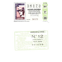 - Décimo da Lotaría Nacional de 1975 co motivo "A filatelia": representación dun selo conmemorativo do Día Mundial do Selo de 1967 coa imaxe de "Mercurio mensajero de los dioses". O número do décimo é o 56173 / ANVERSO. Impresión / 56173 / Lotería Nacional. Décima parte del billete para el sorteo del día 18 de enero de 1975 / El jefe del servicio (sinatura) / Décima / 56173 / 3/75 / 10ª / 2ª serie / Precio 100 pesetas / Mercurio mensajero de los dioses (imaxe) / Fca. Nal. de Moneda y Timbre / REVERSO. Impresión / Sorteo del día 18 de enero de 1975. Sistema moderno. 10 series de 80.000 billetes de 1.000 pesetas. (Resumo de premios) / Extracto de la instrucción de Loterías (texto) / Próximo sorteo: 25 de enero. Billetes de 500 ptas., en décimos a 50 ptas