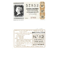 - Décimo da Lotaría Nacional de 1975 co motivo "A filatelia": imaxe que representa o primeiro selo do mundo emitido o día 1 de maio de 1840 coñecido como "Penique Negro". O número do décimo é o 57852 / ANVERSO. Impresión / 57852 / Lotería Nacional. Décima parte del billete para el sorteo del día 25 de enero de 1975 / El jefe del servicio (sinatura) / Sexta / 57852 / 4/75 / 6ª / 15ª serie / Precio 50 pesetas / Primer sello del mundo (imaxe) / Fca. Nal. de Moneda y Timbre / REVERSO. Impresión / Sorteo del día 25 de enero de 1975. Sistema moderno. 15 series de 80.000 billetes de 500 pesetas. (Resumo de premios) / Extracto de la instrucción de Loterías (texto) / Extracto de la instrucción de Loterías (texto) / Próximo sorteo: 1 de febrero. Billetes de 1.000 ptas., en décimos a 100 ptas