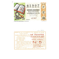- Décimo da Lotaría nacional de 1975 co motivo "A filatelia": imaxe que representa útiles de coleccionista filatélico. O número do décimo é o 41907 / ANVERSO. Impresión / 41907 / Lotería Nacinal. Décima parte del billete para el sorteo del día 8 de febrero de 1975 / El jefe del servicio (sinatura) / Primera / 41907 / 6/75 / 1ª / 8ª serie / Precio 100 pesetas / Útiles de coleccionista filatélico (imaxe) / Fca. Nal. de Moneda y Timbre / REVERSO. Impresión / Sorteo del día 8 de febrero de 1975. Sistema moderno. 10 series de 80.000 billetes de 1.000 pesetas. (Resumo de premios) / Extracto de la instrucción de Loterías (texto) / Próximo sorteo: 15 de febrero. Billetes de 2.000 ptas., en décimos a 200 ptas