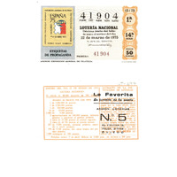- Décimo da Lotaría Nacional de 1975 co motivo "A filatelia":representación dun selo co anuncio da Exposición Mundial de Filatelia de 1975. O número do décimo é o 41904 / ANVERSO. Impresión / 41904 / Lotería Nacional. Décima parte del billete para el sorteo del día 22 de marzo de 1975 / El jefe del servicio (sinatura) / Primera / 41904 / 12/75 / 1ª / 14ª serie / Precio 50 pesetas / Anuncio Exposición Mundial de Filatelia (imaxe) / Fca. Nal. de Moneda y Timbre / REVERSO. Impresión / Sorteo del día 22 de marzo de 1975. Sistema moderno. 15 series de 80.000 billetes de 500 pesetas. (Resumo de premios) / Extracto de la instrucción de Loterías (texto) / Próximo sorteo: 5 de abril. Billetes de 2.000 ptas., en décimos a 200 ptas