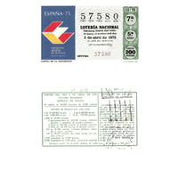 - Décimo "Especial de Pascua" da Lotaría Nacional de 1975 co motivo "A filatelia": imaxe que representa un cartel da Exposición Mundial de Filatelia de 1975. O número do décimo é o 57580 / ANVERSO. Impresión / 57580 / Lotería Nacional. Décima parte del billete para el sorteo del día 5 de abril de 1975 / El jefe del servicio (sinatura) / Séptima / 57580 / 13/75 / 7ª / 5ª serie / Precio 200 pesetas / Cartel de la Exposición (imaxe) / Fca. Nal. de Moneda y Timbre / REVERSO. Impresión / Sorteo del día 5 de abril de 1975. Sistema moderno. Especial de Pascua. 10 series de 80.000 billetes de 2.000 pesetas. (Resumo de premios) / Extracto de la instrucción de Loterías (texto) / Próximo sorteo: 12 de abril. Billetes de 1.000 ptas., en décimos a 100 ptas