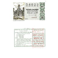 - Décimo da Lotaría Nacional de 1975 co motivo "A filatelia": imaxe que representa o Pazo de Comunicacións de Madrid. O número do décimo é o 54023 / ANVERSO. Impresión / 54023 / Lotería Nacional. Décima parte del billete para el sorteo del día 26 de abril de 1975 / El jefe del servicio (sinatura) / Sexta / 54023 / 16/75 / 6ª / 5ª serie / precio 50 pesetas / Palacio de Comunicaciones (imaxe) / Fca. Nal. de Moneda y Timbre / REVERSO. Impresión / Sorteo del día 26 de abril de 1975. Sistema moderno. 15 series de 80.000 billetes de 500 pesetas. (Resumo de premios) / Extracto de la instrucción de Loterías (texto) / Próximo sorteo: 3 de mayo. Billetes de 2.000 pesetas en décimos de 200 ptas