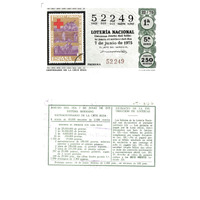 - Décimo "Extraordinario da Cruz Vermella" da Lotaría Nacional de 1975 co motivo "A filatelia": representación dun selo conmemorativo do primeiro centenario da fundación da Cruz Vermella. O número do décimo é o 52249 / ANVERSO. Impresión / 52249 / Lotería Nacional. Décima parte del billete para el sorteo del día 7 de junio de 1975 / El jefe del servicio (sinatura) / Primera / 52249 / 29/75 / 1ª / 5ª serie / Precio 250 pesetas / Centenario de la Cruz Roja (imaxe) / Fca. Nal. de Moneda y Timbre / REVERSO. Impresión / Sorteo del día 7 de junio de 1975. Sistema moderno. Extraordinario de la Cruz Roja. 8 series de 80.000 billetes de 2.500 pesetas. (Resumo de premios) / Extracto de la instrucción de Loterías (texto) / Próximo sorteo: 14 de junio. Billetes de 1.000 ptas., en décimos de 100 ptas