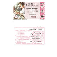- Décimo da Lotaría Nacional de 1975 co motivo "A filatelia": imaxe que representa o procedemento de debuxo do orixinal dun selo. O número do décimo é o 79961 / ANVERSO. Impresión / 79961 / Lotería Nacional. Décima parte del billete para el sorteo del día 21 de junio de 1975 / El jefe del servicio (sinatura) / Quinta / 79961 / 24/75 / 5ª / 4ª serie / Precio 100 pesetas / Dibujo del original de un sello (imaxe) / Fca. Nal. de Moneda y Timbre / REVERSO. Impresión / Sorteo del día 21 de junio de 1975. Sistema moderno. 12 series de 80.000 billetes de 1.000 pesetas. (Resumo de premios) / Próximo sorteo: 28 de junio. Billetes de 500 ptas., en décimos de 50 ptas