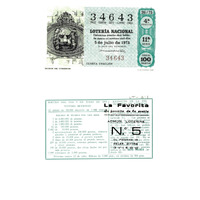 - Décimo da Lotaría Nacional de 1975 co motivo "A filatelia": imaxe que representa un buzón de Correos. O número do décimo é o 34643 / ANVERSO. Impresión / 34643 / Lotería Nacional. Décima parte del billete para el sorteo del día 5 de julio de 1975 / El jefe del servicio (sinatura) / Cuarta fracción / 34643 / 26/75 / 4ª fracción / 11ª serie / Precio 100 pesetas / Buzón de Correos (imaxe) / Fca. Nal. de Moneda y Timbre / REVERSO. Impresión / Sorteo del día 5 de julio de 1975. Sistema moderno. 12 series de 80.000 billetes de 1.000 pesetas. (Resumo de premios) / Extracto de la instrucción de Loterías (texto) / Próximo sorteo: 12 de julio. Billetes de 5.000 ptas., en décimos de 500 ptas