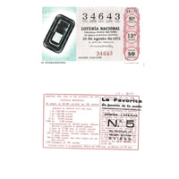 - Décimo da Lotaría Nacional de 1975 co motivo "A filatelia": imaxe que representa un "filigranoscopio", un aparello que sirve para detectar a filigrana ou marca de auga. O número do décimo é o 34643 / ANVERSO. Impresión / 34643 / Lotería Nacional. Décima parte del billete para el sorteo del día 30 de agosto de 1975 / El jefe del servicio (sinatura) / Décima fracción / 34643 / 34/75 / 10ª fracción / 13ª serie / Precio 50 pesetas / El filigranoscopio (imaxe) / Fca. Nal. de Moneda y Timbre / REVERSO. Impresión / Sorteo del día 30 de agosto de 1975. Sistema moderno. 18 series de 80.000 billetes de 500 pesetas. (Resumo de premios) / Extracto de la instrucción de Loterías (texto) / Próximo sorteo: 6 de septiembre. Billetes de 1.000 ptas., en décimos de 100 ptas