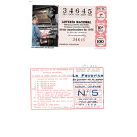 - Décimo da Lotaría Nacional de 1975 co motivo "A filatelia": imaxe que representa o procedemento de estampación de selos. O número do décimo é o 34645 / ANVERSO. Impresión / 34645 / Lotería Nacional. Décima parte del billete para el sorteo del día 20 de septiembre de 1975 / El jefe del servicio (sinatura) / Primera fracción / 34645 / 37/75 / 1ª fracción / 10ª serie / Precio 100 pesetas / Estampación de sellos (imaxe) / Fca. Nal. de Moneda y Timbre / REVERSO. Impresión / Sorteo del día 20 de septiembre 1975. Sistema moderno. 10 series de 80.000 billetes de 1.000 pesetas. (Resumo de premios) / Extracto de la instrucción de Loterías (texto) / Próximo sorteo: 27 de septiembre. Billetes de 500 ptas., en décimos de 50 ptas