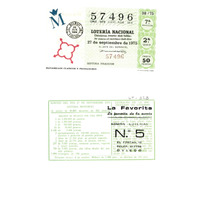 - Décimo da Lotaría Nacional de 1975 co motivo "A filatelia": imaxe que representa cuños clásicos e fechadores. O número do décimo é o 57496 / ANVERSO. Impresión / 57496 / Lotería Nacional. Décima parte del billete para el sorteo del día 27 de septiembre de 1975 / El jefe del servicio (sinatura) / Séptima fracción / 57496 / 38/75 / 7ª fracción / 2ª serie / Precio 50 pesetas / Matasellos clásicos y fechadores (imaxe) / REVERSO. Impresión / Sorteo del día 27 de septiembre 1975. Sistema moderno. 16 series de 80.000 billetes de 500 pesetas. (Resumo de premios) / Extracto de la instrucción de Loterías (texto) / Próximo sorteo: 4 de octubre. Billetes de 1.000 ptas., en décimos de 100 ptas