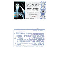 - Décimo "Extraordinario do Día do Neno" da Lotaría Nacional de 1976 co motivo "Sistemas de comunicación": imaxe que representa a estrela de Belén. O número do décimo 00009 / ANVERSO. Impresión / 00009 / Lotería Nacional. Décima parte del billete para el sorteo del día 5 de enero de 1976 / El jefe del servicio (sinatura) / Segunda fracción / 00009 / 1/76 / 2ª fracción / 18ª serie / Precio 500 pesetas / La estrella de Belén (imaxe) / Fca. Nal. de Moneda y Timbre / REVERSO. Impresión / Sorteo del día 5 de enero de 1976. Sistema moderno. Extraordinario de "El Niño". 18 series de 80.000 billetes de 5.000 pesetas. (Resumo de premios) / Extracto de la instrucción de Loterías (texto) / Próximo sorteo: 17 de enero. Billetes de 2.000 ptas., en décimos de 200 ptas