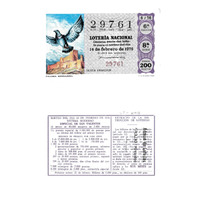 - Décimo "Especial de San Valentín" da Lotaría Nacional de 1976 co motivo "Sistemas de comunicación": imaxe que representa unha paloma mensaxeira. O número do décimo é o 29761 / ANVERSO. Impresión / 29761 / Lotería Nacional. Décima parte del billete para el sorteo del día 14 de febrero de 1976 / El jefe del servicio (sinatura) / Sexta fracción / 29761 / 6/76 / 6ª fracción / 8ª serie / Precio 200 pesetas / REVERSO. Impresión / Sorteo del día 14 de febrero de 1976. Sistema moderno. Especial de San Valentín. 10 series de 80.000 billetes de 2.000 pesetas / Extracto de la instrucción de Loterías (texto) / Próximo sorteo: 21 de febrero. Billetes de 1.000 ptas., en décimos de 100 ptas