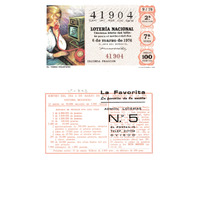 - Décimo da Lotaría Nacional de 1976 co motivo "Sistemas de comunicación": imaxe que representa unha rapaza utilizando o video-teléfono. O número do décimo é o 41904 / ANVERSO. Impresión / 41904 / Lotería Nacional. Décima parte del billete para el sorteo del día 6 de marzo de 1976 / El jefe del servicio (sinatura) / Segunda fracción / 41904 / 9/76 / 2ª fracción / 7ª serie / Precio 100 pesetas / El video-teléfono (imaxe) / Fca. Nal. de Moneda y Timbre / REVERSO. Impresión / Sorteo del día 6 de marzo de 1976. Sistema moderno. 12 series de 80.000 billetes de 1.000 pesetas. (Resumo de premios) / Extracto de la instrucción de Loterías (texto) / Próximo sorteo: 13 de marzo. Billetes de 2.000 ptas., en décimos de 200 ptas