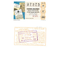 - Décimo "Especial de Primavera" da Lotaría Nacional de 1976 co motivo "Sistemas de comunicación": imaxe que representa os primeiros diarios. O número do décimo é o 27375 / ANVERSO. Impresión / 27375 / Lotería Nacional. Décima parte del billete para el sorteo del día 13 de marzo de 1976 / El jefe del servicio (sinatura) / Octava fracción / 27375 / 10/76 / 8ª fracción / 2ª serie / Precio 200 pesetas / Primeros diarios (imaxe) / Fca. Nal. de Moneda y Timbre / REVERSO. Impresión / Sorteo del día 13 de marzo de 1976. Sistema moderno. Especial de primavera. 10 series de 80.000 billetes de 2.000 pesetas. (Resumo de premios) / Extracto de la instrucción de Loterías (texto) / Próximo sorteo: 20 de marzo. Billetes de 1.000 ptas., en décimos de 100 ptas