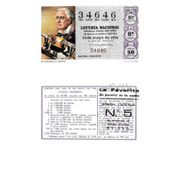 - Décimo da Lotaría Nacional de 1976 co motivo "Sistemas de comunicación": imaxe que representa a Thomas Alva Edison, inventor do fonógrafo. O número do décimo é o 34646 / ANVERSO. Impresión / 34646 / Lotería Nacional. Décima parte del billete para el sorteo del día 29 de mayo de 1976 / El jefe del servicio (sinatura) / Décima fracción / 34646 / 20/76 / 10ª fracción / 8ª serie / Precio 50 pesetas / El fonógrafo. Edison (imaxe) / Fca. Nal. de Moneda y Timbre / REVERSO. Impresión / Sorteo del día 29 de mayo de 1976. Sistema moderno. 18 series de 80.000 billetes de 500 pesetas. (Resumo de premios) / Extracto de la instrucción de Loterías (texto) / Próximo sorteo: 5 de junio. Billetes de 2.500 ptas., en décimos de 250 ptas