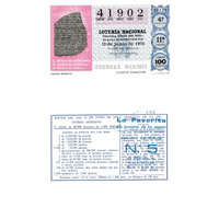 - Décimo da Lotaría Nacional de 1976 co motivo "Sistemas de comunicación": imaxe que representa a Pedra Rosetta. O número do décimo é o 41902 / ANVERSO. Impresión / 41902 / Lotería Nacional. Décima parte del billete para el sorteo del día 12 de junio de 1976 / El jefe del servicio (sinatura) / 2260411 - 041902 / 22/76 / 4ª fracción / 11ª serie / Precio 100 pesetas / Pedra Rosetta (imaxe) / Cuarta fracción / Fca. Nal. de Moneda y Timbre / REVERSO. Impresión / Sorteo del día 12 de junio de 1976. Sistema moderno. 13 series de 80.000 billetes de 1.000 pesetas. (Resumo de premios) / Extracto de la instrucción de Loterías (texto) / Próximo sorteo: 19 de junio. Billetes de 1.000 ptas., en décimos de 100 ptas