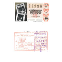 - Décimo da Lotaría Nacional de 1976 co motivo "Sistemas de comunicación": imaxe que representa os primeiros xornais ilustrados. O número do décimo é o 66605 / ANVERSO. Impresión / 66605 / Lotería Nacional. Décima parte del billete para el sorteo del día 17 de julio de 1976 / El jefe del servicio (sinatura) / 2760907 - 066605 / 27/76 / 9ª fracción / 7ª serie / Precio 100 pesetas / Primeros periódicos ilustrados (imaxe) / Novena fracción / Fca. Nal. de Moneda y Timbre / REVERSO. Impresión / Sorteo del día 17 de julio de 1976. Sistema moderno. 12 series de 80.000 billetes de 1.000 pesetas. (Resumo de premios) / Extracto de la instrucción de Loterías (texto) / Próximo sorteo: 24 de julio. Billetes de 1.000 ptas., en décimos de 100 ptas