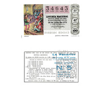 - Décimo da Lotaría Nacional de 1976 co motivo "Sistemas de comunicación": imaxe que representa un xograr. O número do decimo é o 34643 / ANVERSO. Impresión / 34643 / Lotería Nacional. Lotería Nacional. Décima parte del billete para el sorteo del día 24 de julio de 1976 / El jefe del servicio (sinatura) / 2860504 - 034643 / 28/76 / 5ª fracción / 4ª serie / Precio 100 pesetas / Juglar (imaxe) / Quinta fracción / Fca. Nal. de Moneda y Timbre / REVERSO. Impresión / Sorteo del día 24 de julio de 1976. Sistema moderno. 12 series de 80.000 billetes de 1.000 pesetas. (Resumo de premios) / Extracto de la instrucción de Loterías (texto) / Próximo sorteo: 31 de julio. Billetes de 500 ptas., en décimos de 50 ptas