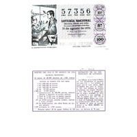 - Décimo da Lotaría Nacional de 1976 co motivo "Sistemas de comunicación": imaxe dunha entrevista realizada cun magnetófono. O número do décimo é o 57356 / ANVERSO. Impresión / 57356 / Lotería Nacional. Décima parte del billete para el sorteo del día 21 de agosto de 1976 / El jefe del servicio (sinatura) / 3261008 - 057356 / 32/76 / 10ª fracción / 8ª serie / Precio 100 pesetas / El magnetófono. Entrevista (imaxe) / Décima fracción / Fca. Nal. de Moneda y Timbre / REVERSO. Impresión / Sorteo del día 21 de agosto de 1976. Sistema moderno. 12 series de 80.000 billetes de 1.000 pesetas. (Resumo de premios) / Extracto de la instrucción de Loterías (texto) / Próximo sorteo: 28 de agosto. Billetes de 500 ptas., en décimos de 50 ptas