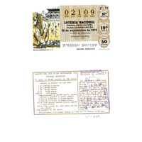 - Décimo da Lotaría Nacional de 1976 co motivo "Sistema de comunicación": imaxe que representa unha retransmisión en T.V. O número do décimo é o 02109 / ANVERSO. Impresión / 02109 / Lotería Nacional. Décima parte del billete para el sorteo del día 25 de septiembre de 1976 / El jefe del servicio (sinatura) / 3761019 - 002109 / 37/76 / 10ª fracción / 19ª serie / Precio 50 pesetas / Retransmisión en T.V (imaxe) / Décima fracción / Fca. Nal. de Moneda y Timbre / REVERSO. Impresión / Sorteo del día 25 de septiembre 1976. Sistema moderno. 21 series de 80.000 billetes de 500 pesetas. (Resumo de premios) / Extracto de la instrucción de Loterías (texto) / Próximo sorteo: 2 de octubre. Billetes de 1.000 ptas., en décimos de 100 ptas