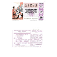 - Décimo da Lotaría Nacional de 1976 co motivo "Sistemas de comunicación": imaxe que representa unha rolda de prensa. O número do décimo é o 41904 / ANVERSO. Impresión / 41904 / Lotería Nacional. Décima parte del billete para el sorteo del día 2 de octubre de 1976 / El jefe del servicio (sinatura) / 3860613 - 041904 / 38/76 / 6ª fracción / 13ª serie / Precio 100 pesetas / Rueda de prensa (imaxe) / Sexta fracción / Fca. Nal. de Moneda y Timbre / REVERSO. Impresión / Sorteo del día 2 de octubre de 1976. Sistema moderno. 13 series de 80.000 billetes de 1.000 pesetas. (Resumo de premios) / Extracto de la instrucción de Loterías (texto) / Próximo sorteo: 9 de octubre. Billetes de 2.000 ptas., en décimos de 200 ptas