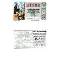 - Décimo "Especial da Amizade" da Lotaría Nacional de 1976 co motivo Sistemas de comunicación: imaxe que representa un copista de libros. O número do décimo é o 41909 / ANVERSO. Impresión / 41909 / Lotería Nacional. Décima parte del billete para el sorteo del día 16 de octubre de 1976 / El jefe del servicio (sinatura) / 4060901 - 041909 / 40/76 / 9ª fracción / 1ª serie / Precio 200 pesetas / Copista de libros (imaxe) / Novena fracción / Fca. Nal. de Moneda y Timbre / REVERSO. Impresión / Sorteo del día 16 de octubre de 1976. Sistema moderno. Especial de la amistad. 10 series de 80.000 billetes de 2.000 pesetas. (Resumo de premios) / Extracto de la instrucción de Loterías (texto) / Próximo sorteo: 23 de octubre. Billetes de 1.000 ptas., en décimos de 100 ptas