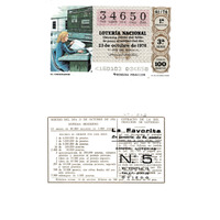 - Décimo da Lotaría Nacional de 1976 co motivo "Sistemas de comunicación": imaxe que representa un ordenador. O número do décimo é o 34650 / ANVERSO. Impresión / 34650 / Lotería Nacional. Décima parte del billete para el sorteo del día 23 de octubre de 1976 / El jefe del servicio (sinatura) / 4160103 - 034650 / 41/76 / 1ª fracción / 3ª serie / Precio 100 pesetas / El ordenador (imaxe) / Primera fracción / Fca. Nal. de Moneda y Timbre / REVERSO. Impresión / Sorteo del día 23 de octubre de 1976. Sistema moderno. 13 series de 80.000 billetes de 1.000 pesetas. (Resumo de premios) / Extracto de la instrucción de Loterías (texto) / Próximo sorteo: 30 de octubre. Billetes de 500 ptas., en décimos de 50 ptas