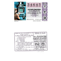 - Décimo da Lotaría Nacional de 1976 co motivo "Sistemas de comunicación": imaxe que representa un microfilme. O número do décimo é o 34643 / ANVERSO. Impresión / 34643 / Lotería Nacional. Décima parte del billete para el sorteo del día 30 de octubre de 1976 / El jefe del servicio (sinatura) / 4260603 - 034643 / 42/76 / 6ª fracción / 8ª serie / Precio 50 pesetas / Microfilm (imaxe) / Sexta fracción / Fca. Nal. de Moneda y Timbre / REVERSO. Impresión / Sorteo del día 30 de octubre de 1976. Sistema moderno. 21 series de 80.000 billetes de 500 pesetas. (Resumo de premios) / Extracto de la instrucción de Loterías (texto) / Próximo sorteo: 6 de noviembre. Billetes de 2.000 ptas., en décimos de 200 ptas