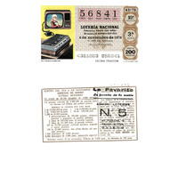 - Décimo "Especial de Outono" da Lotaría Nacional de 1976 co motivo "Sistemas de comunicación": imaxe que representa un videocasete. O número do décimo é o 56841 / ANVERSO. Impresión / 56841 / Lotería Nacional. Décima parte del billete para el sorteo del día 6 de noviembre de 1976 / El jefe del servicio (sinatura) / 4361003 - 056841 / 43/76 / 10ª fracción / 3ª serie / Precio 200 pesetas / El video-casette (imaxe) / Décima fracción / Fca. Nal. de Moneda y Timbre / REVERSO. Impresión / Sorteo del día 6 de noviembre 1976. Especial de otoño. Sistema moderno. 10 series de 80.000 billetes de 2.000 pesetas. (Resumo de premios) / Extracto de la instrucción de Loterías (texto) / Próximo sorteo: 13 de noviembre. Billetes de 1.000 ptas., en décimos de 100 ptas