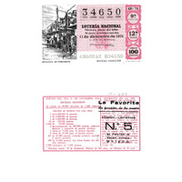 - Décimo da Lotaría Nacional de 1976 co motivo "Sistemas de comunicación": imaxe que representa unha rotativa de xornais. O número do décimo é o 34650 / ANVERSO. Impresión / 34650 / Lotería Nacional. Décima parte del billete para el sorteo del día 11 de diciembre de 1976 / El jefe del servicio (sinatura) / 4860912 - 034650 / 48/76 / 9ª fracción / 12ª serie / Precio 100 pesetas / Rotativa de periódicos (imaxe) / Novena fracción / Fca. Nal. de Moneda y Timbre / REVERSO. Impresión / Sorteo del día 11 de diciembre 1976. Sistema moderno. 12 series de 80.000 billetes de 1.000 pesetas. (Resumo de premios) / Extracto de la instrucción de Loterías (texto) / Próximo sorteo: 18 de diciembre. Billetes de 500 ptas., en décimos de 50 ptas