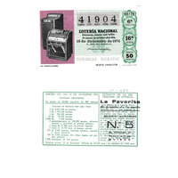 - Décimo da Lotaría Nacional de 1976 co motivo "Sistemas de comunicación": imaxe que representa un telefax. O número do décimo é o 41904 / ANVERSO. Impresión / 41904 / Lotería Nacional. Décima parte del billete para el sorteo del día 18 de diciembre de 1976 / El jefe del servicio (sinatura) / 4960616 - 041904 / 49/79 / 6ª fracción / 16ª serie / Precio 50 pesetas / El telefacsímil (imaxe) / Sexta fracción / Fca. Nal. de Moneda y Timbre / REVERSO. Impresión / Sorteo del día 18 de diciembre 1976. Sistema moderno. 18 series de 80.000 billetes de 500 pesetas. (Resumo de premios) / Extracto de la instrucción de Loterías (texto) / Próximo sorteo: 22 de diciembre. Billetes de 10.000 ptas., en décimos de 1.000 ptas