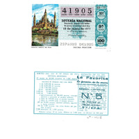 - Décimo da Lotaría Nacional de 1977 co motivo "As provincias españolas": imaxe que representa a Basílica do Pilar de Zaragoza. O número do décimo é o 41905 / ANVERSO. Impresión / 41905 / Lotería Nacional. Décima parte del billete para el sorteo del día 18 de junio de 1977 / El jefe del servicio (sinatura) / 2371009 - 041905 / 23/77 / 10ª fracción / 9ª serie / Precio 100 pesetas / Zaragoza. Basílica del Pilar (imaxe) / Décima fracción / Fca. Nal. de Moneda y Timbre / REVERSO. Impresión / Sorteo del día 18 de junio de 1977. Sistema moderno. 17 series de 80.000 billetes de 1.000 pesetas. (Resumo de premios) / Extracto de la instrucción de Loterías (texto) / Próximo sorteo: 25 de junio. Billetes de 1.000 ptas., en décimos de 100 ptas