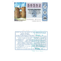 - Décimo "Especial de Verán" da Lotaría Nacional de 1977 co motivo "As provincias españolas": imaxe que representa a Porta de San Vicente de Ávila. O número do décimo é o 56582 / ANVERSO. Impresión / 56582 / Lotería Nacional. Décima parte del billete para el sorteo del día 6 de agosto de 1977 / El jefe del servicio (sinatura) / 3070105 - 056582 / 30/77 / 1ª fracción / 5ª serie / Precio 200 pesetas / Ávila. Puerta de San Vicente (imaxe) / Primera fracción / Fca. Nal. de Moneda y Timbre / REVERSO. Impresión / Sorteo del día 6 de agosto de 1977. Sistema moderno. Especial de verano. 14 series de 80.000 billetes de 2.000 pesetas. (Resumo de premios) / Extracto de la instrucción de Loterías (texto) / Próximo sorteo: 13 de agosto. Billetes de 1.000 ptas., en décimos de 100 ptas
