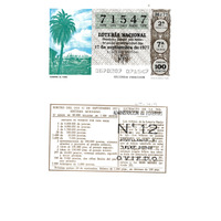 - Décimo da Lotaría Nacional de 1977 co motivo "As provincias españolas": imaxe que representa o Teide, en Tenerife. O número do décimo é o 71547 / ANVERSO. Impresión / 71547 / Lotería Nacional. Décima parte del billete para el sorteo del día 17 de septiembre de 1977 / El jefe del servicio (sinatura) / 3670207 - 071547 / 36/77 / 2ª fracción / 7ª serie / Precio 100 pesetas / Tenerife. El Teide (imaxe) / Segunda fracción / Fca. Nal. de Moneda y Timbre / REVERSO. Impresión / Sorteo del día 17 de septiembre 1977. Sistema moderno. 17 series de 80.000 billetes de 1.000 pesetas. (Resumo de premios) / Extracto de la instrucción de Loterías (texto) / Próximo sorteo: 24 de septiembre. Billetes de 1.000 ptas., en décimos de 100 ptas