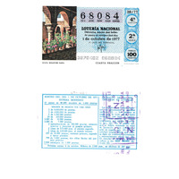 - Décimo da Lotaría Nacional de 1977 co motivo "As provincias españolas": imaxe que representa o Mosteiro da Rábida, en Huelva. O número do décimo é o 68084 / ANVERSO. Impresión / 68084 / Lotería Nacional. Décima parte del billete para el sorteo del día 1 de octubre de 1977 / El jefe del servicio (sinatura) / 3870402 - 068084 / 38/77 / 4ª fracción / 2ª serie / Precio 100 pesetas / Huelva. Monasterio Rábida (imaxe) / Cuarta fracción / Fca. Nal. de Moneda y Timbre / REVERSO. Impresión / Sorteo del día 1 de octubre de 1977. Sistema moderno. 17 series de 80.000 billetes de 1.000 pesetas. (Resumo de premios) / Extracto de la instrucción de Loterías (texto) / Próximo sorteo: 8 de octubre. Billetes de 2.000 ptas., en décimos de 200 ptas