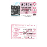 - Décimo da Lotaría Nacional de 1977 co motivo "As provincias españolas": imaxe que representa o Pazo do Infantado, en Guadalaxara. O número do décimo é o 40764 / ANVERSO. Impresión / 40764 / Lotería Nacional. Décima parte del billete para el sorteo del día 22 de octubre de 1977 / El jefe del servicio (sinatura) / 4170108 - 040764 / 41/77 / 1ª fracción / 8ª serie / Precio 100 pesetas / Guadalajara. Palacio del Infantado (imaxe) / Primera fracción / Fca. Nal. de Moneda y Timbre / REVERSO. Impresión / Sorteo del día 22 de octubre de 1977. Sistema moderno. 17 series de 80.000 billetes de 1.000 pesetas. (Resumo de premios) / Extracto de la instrucción de Loterías (texto) / Próximo sorteo: 29 de octubre. Billetes de 1.000 ptas., en décimos de 100 ptas