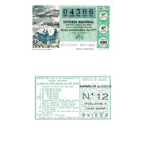 - Décimo da Lotaría Nacional de 1977 co motivo "As provincias españolas": imaxe que representa unha vista xeral da cidade de Xaén. O número do décimo é o 04306 / ANVERSO. Impresión / 04306 / Lotería Nacional. Décima parte del billete para el sorteo del día 26 de noviembre de 1977 / El jefe del servicio (sinatura) / 4670604 - 004306 / 46/77 / 6ª fracción / 4ª serie / Precio 100 pesetas / Jaén. La ciudad. Vista general (imaxe) / Sexta fracción / Fca. Nal. de Moneda y Timbre / REVERSO. Impresión / Sorteo del día 26 de noviembre 1977. Sistema moderno. 17 series de 80.000 billetes de 1.000 pesetas. (Resumo de premios) / Extracto de la instrucción de Loterías (texto) / Próximo sorteo: 3 de diciembre. Billetes de 1.000 ptas., en décimos de 100 ptas