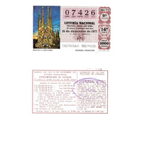 - Décimo "Extraordinario de Nadal" da Lotaría Nacional de 1977 co motivo "As provincias españolas": imaxe que representa a Sagrada Familia de Barcelona. O número do décimo é o 07426 / ANVERSO. Impresión / 07426 / Lotería Nacional. Décima parte del billete para el sorteo del día 22 de diciembre de 1977 / El jefe del servicio (sinatura) / 5070914 - 007426 / 50/77 / 9ª fracción / 17ª serie / Precio 2.000 pesetas / Barcelona. La Sagrada Familia (imaxe) / Novena fracción / Fca. Nal. de Moneda y Timbre / REVERSO. Impresión / Sorteo del día 22 de diciembre 1977. Sistema tradicional. Extraordinario de Navidad. 25 series de 65.000 billetes de 20.000 pesetas. (Resumo de premios) / Extracto de la instrucción de Loterías (texto) / Próximo sorteo: 5 de enero. Billetes de 10.000 ptas., en décimos de 1.000 ptas
