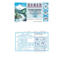 - Décimo "Extraordinario do Día do Neno" da Lotaría Nacional de 1978 co motivo "Os Recursos naturais":imaxe que representa unhas cumes nevadas. O número do décimo é o 54419 / ANVERSO. Impresión / 51419 / Lotería Nacional. Décima parte del billete para el sorteo del día 5 de enero de 1978 / El jefe del servicio (sinatura) / 0180816 - 051419 / 1/78 / 8ª fracción / 16ª serie / Precio 1000 pesetas / Cumbres nevadas (imaxe) / Octava fracción / Fca. Nal. de Moneda y Timbre / REVERSO. Impresión / Sorteo del día 5 de enero de 1978. Sistema moderno. Extraordinario de "El Niño". 20 series de 80.000 billetes de 10.000 pesetas. (Resumo de premios) / Extracto de la instrucción de Loterías (texto) / Próximo sorteo: 14 de enero. Billetes de 2.000 ptas., en décimos de 200 ptas