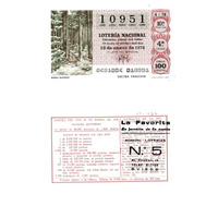 - Décimo da Lotaría Nacional de 1978 co motivo "Os Recursos naturais": imaxe que representa un bosque madereiro. O número do décimo é o 10951 / ANVERSO. Impresión / 10951 / Lotería Nacional. Décima parte del billete para el sorteo del día 28 de enero de 1978 / El jefe del servicio (sinatura) / 0481004 - 010951 / 4/78 / 10ª fracción / 4ª serie / Precio 100 pesetas / Bosque maderero (imaxe) / Décima frácción / Fca. Nal. de Moneda y Timbre / REVERSO. Impresión / Sorteo del día 28 de enero de 1978. Sistema moderno. 17 series de 80.000 billetes de 1.000 pesetas. (Resumo de premios) / Extracto de la instrucción de Loterías (texto) / Próximo sorteo: 4 de febrero. Billetes de 2.000 ptas., en décimos de 200 ptas