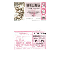 - Décimo da Lotaría Nacional de 1978 co motivo "Os Recursos naturais": imaxe que representa unha explotación madereira. O número do décimo é o 41903 / ANVERSO. Impresión / 41903 / Lotería Nacional. Décima parte del billete para el sorteo del día 25 de febrero de 1978 / El jefe del servicio (sinatura) / 0880610 - 041903 / 8/78 / 6ª fracción / 10ª serie / Precio 100 pesetas / Explotación maderera (imaxe) / Sexta fracción / Fca. Nal. de Moneda y Timbre / REVERSO. Impresión / Sorteo del día 25 de febrero de 1978. Sistema moderno. 18 series de 80.000 billetes de 1.000 pesetas. (Resumo de premios) / Extracto de la instrucción de Loterías (texto) / Próximo sorteo: 4 de marzo. Billetes de 1.000 ptas., en décimos de 100 ptas