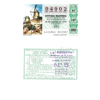 - Décimo "Especial de Pascua" da Lotaría Nacional de 1978 co motivo "Os Recursos naturais": imaxe que representa muíños de vento. O número do décimo é o 04902 / ANVERSO. Impresión / 04902 / Lotería Nacional. Décima parte del billete para el sorteo del día 18 de marzo de 1978 / El jefe del servicio (sinatura) / 1181014 - 004902 / 11/78 / 10ª fracción / 14ª serie / Precio 200 pesetas / Molinos de viento (imaxe) / Décima fracción / Fca. Nal. de Moneda y Timbre / REVERSO. Impresión / Sorteo del día 18 de marzo de 1978. Sistema moderno. Especial de Pascua. 15 series de 80.000 billetes de 2.000 pesetas. (Resumo de premios) / Extracto de la instrucción de de Loterías (texto) / Próximo sorteo: 1 de abril. Billetes de 2.000 ptas., en décimos de 200 ptas