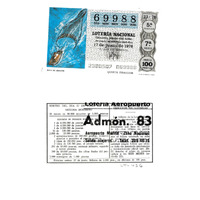 - Décimo da Lotaría Nacional de 1978 co motivo "Os Recursos naturais": imaxe que representa a pesca de arrastre. O número do décimo é o 69988 / ANVERSO. Impresión / 69988 / Lotería Nacional. Décima parte del billete para el sorteo del día 17 de junio de 1978 / El jefe del servicio (sinatura) / 2380507 - 069988 / 23/78 / 5ª fracción / 7ª serie / Precio 100 pesetas / Pesca de arrastre (imaxe) / Quinta fracción / Fca. Nal. de Moneda y Timbre / REVERSO. Impresión / Sorteo del día 17 de junio de 1978. Sistema moderno. 18 series de 80.000 billetes de 1.000 pesetas. (Resumo de premios) / Extracto de la instrucción de Loterías (imaxe) / Próximo sorteo: 23 de junio. Billetes de 1.000 ptas., en décimos de 100 ptas