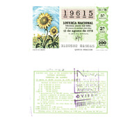 - Décimo "Especial de Agosto" da Lotaría Nacional de 1978 co motivo "Os Recursos naturais": imaxe que representa un cultivo de xirasol. O número do décimo é o 19615 / ANVERSO. Impresión / 19615 / Lotería Nacional. Décima parte del billete para el sorteo del día 12 de agosto de 1978 / El jefe del servicio (sinatura) / 3180502 - 019615 / Cultivo de girasol (sinatura) / Quinta fracción / Fca. Nal. de Moneda y Timbre / REVERSO. Impresión / Sorteo del día 12 de agosto de 1978. Sistema moderno. Especial de agosto. 14 series de 80.000 billetes de 2.000 pesetas. (Resumo de premios) / Extracto de la instrucción de Loterías (texto) / Próximo sorteo: 19 de agosto. Billetes de 1.000 ptas., en décimos de 100 ptas