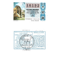 - Décimo da Lotaría Nacional de 1978 co motivo "Os Recursos naturais": imaxe que representa unha roda hidráulica. O número do décimo é o 16192 / ANVERSO. Impresión / 16192 / Lotería Nacional. Décima parte del billete para el sorteo del día 26 de agosto de 1978 / El jefe del servicio (sinatura) / 3380818 - 016192 / 33/78 / 8ª fracción / 18ª serie / Precio 100 pesetas / Rueda hidráulica (imaxe) / Octava fracción / Fca. Nal. de Moneda y Timbre / REVERSO. Impresión / Sorteo del día 26 de agosto de 1978. Sistema moderno. 18 series de 80.000 billetes de 1.000 pesetas. (Resumo de premios) / Extracto de la instrucción de Loterías (texto) / Próximo sorteo: 2 de septiembre. Billetes de 1.000 ptas., en décimos de 100 ptas